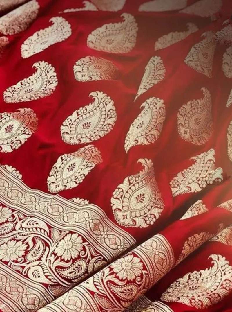 Banarasi textiles from Varanasi, India, are renowned for opulent silk adorned with intricate gold or silver zari work, popular for weddings and festivals.